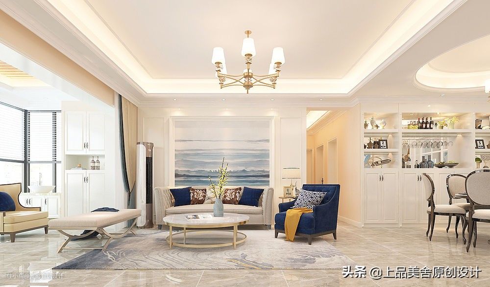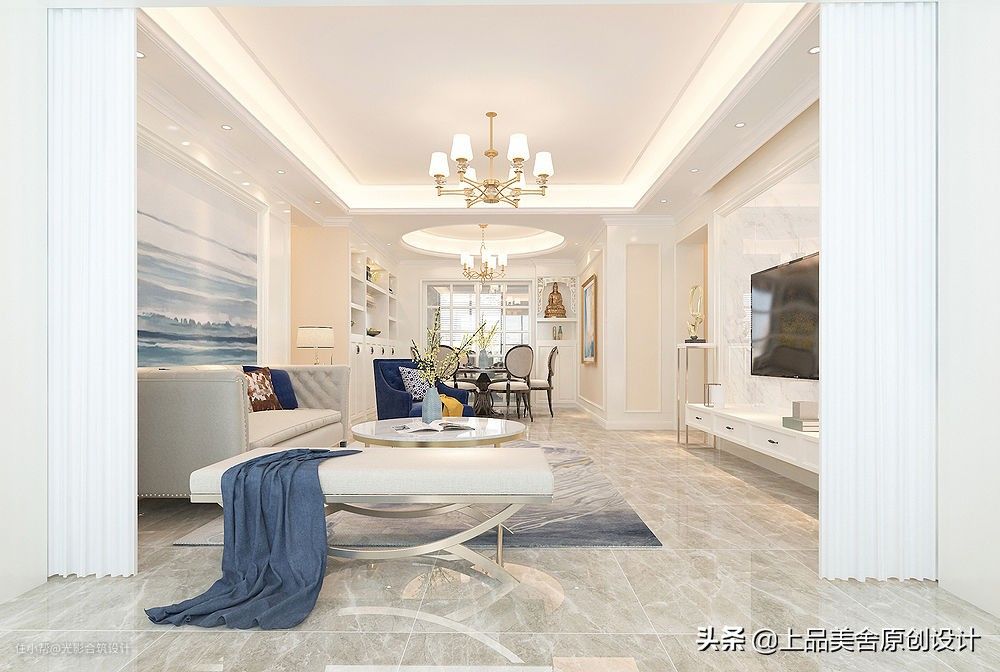 客厅以白色为主基调,沙发背景墙用了整版莫兰迪蓝的海天一色装饰画,两侧用对称石膏线造型来装饰,简洁大方。