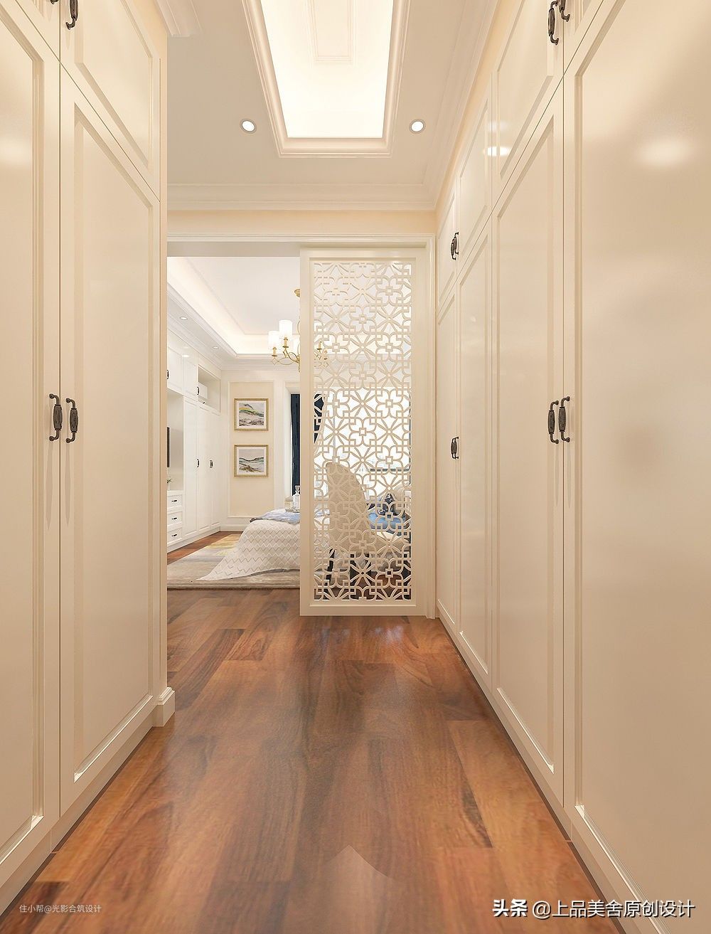 因主卫的门正对着主卧床,因此在中间做了一个镂空隔断来解决这个问题。中间既是通道又是衣帽间,一举两得,还不影响采光。