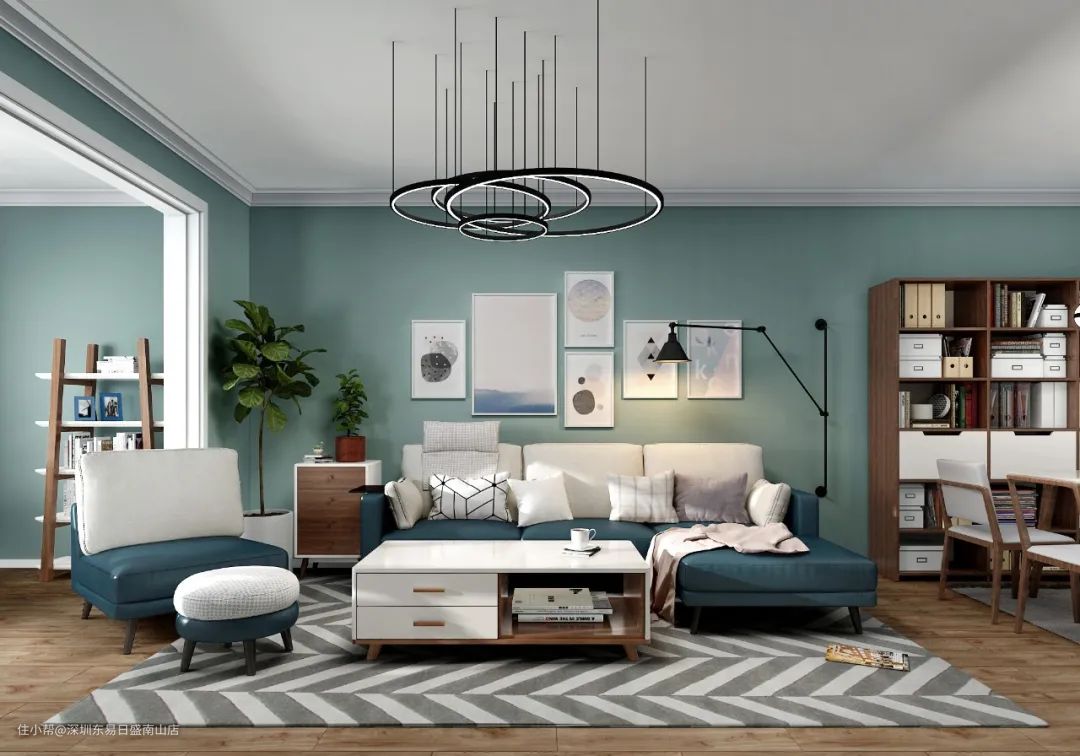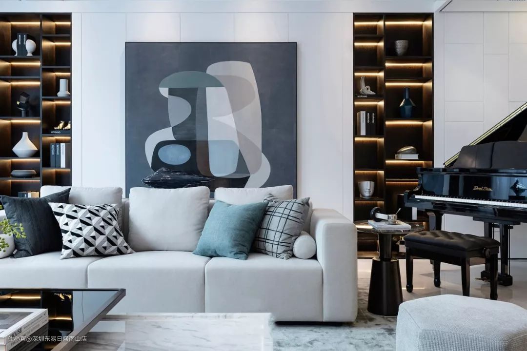 +中性色沙发靠垫跟着挂画,地毯,吊灯走