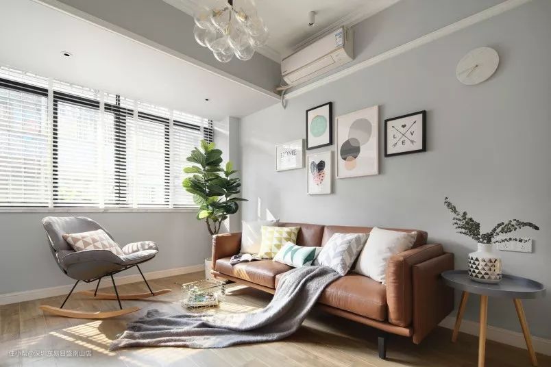 常见的皮沙发也适用这种配色方案,比如“中性色靠垫+几何靠垫”组。