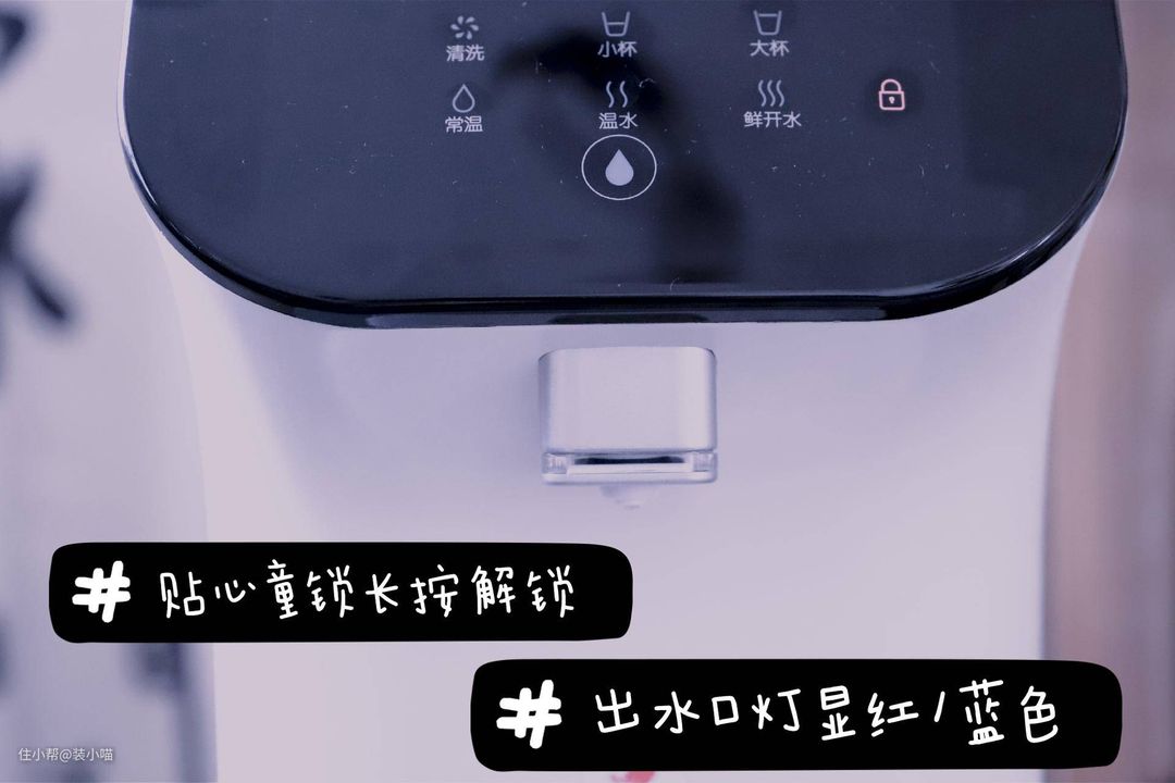 第三个:童锁保护 接水只需要长按即可解锁,接完水30s左右即可自动上锁,防止误触引发安全隐患,这个功能对有小宝宝的家庭来说,真的非常有必要。