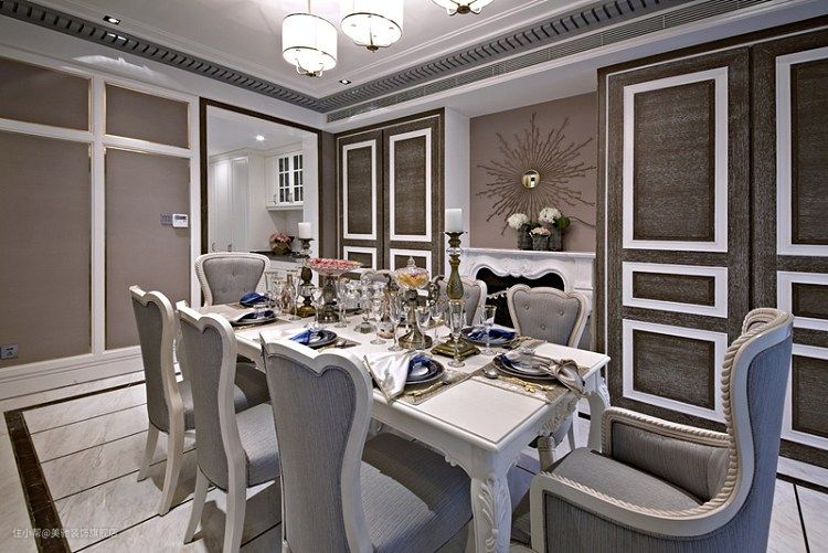 复古又优雅的线框墙是欧式风格里常见的装饰,线框墙能够增强空间层次感让空间不至于太单调。白色和灰色搭配的餐桌椅华丽中带有一种简约风,弧形线条设计和简单的雕花让餐桌显得优雅迷人。