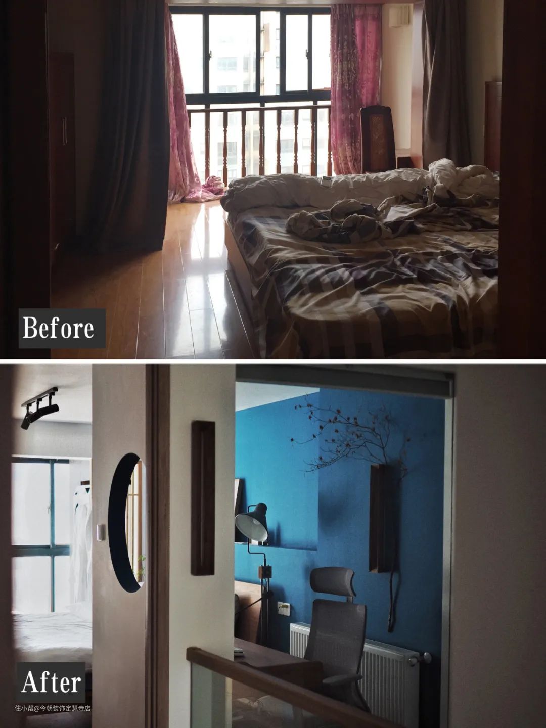 改造前的主卧,空间偏小。牺牲四个平方,转换为一二层的挑高空间,也转换出二层的长廊通道。主卧砸墙装落地玻璃,使一人居空间更为舒畅,在主卧可以了解到整个空间的动态。
