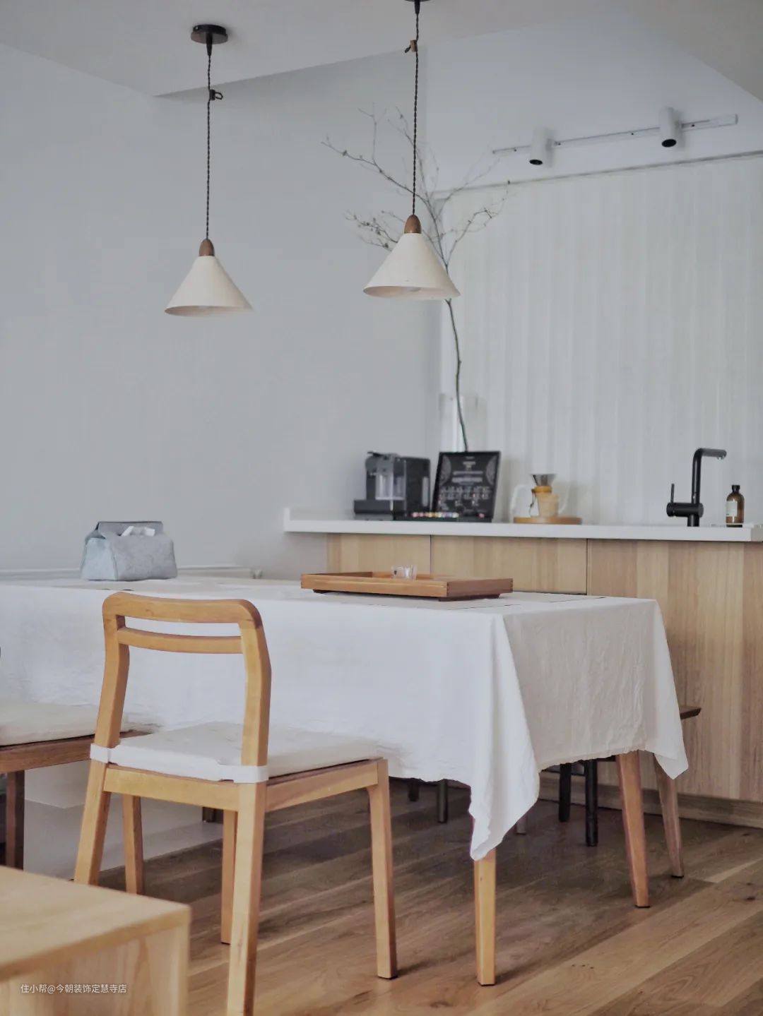 撤去桌布之后,樱桃木餐桌和软装的搭配完全不同于刚入住时的简洁风格,却多了一份的日常生活的烟火气。背景是糖厂送的新春对联。