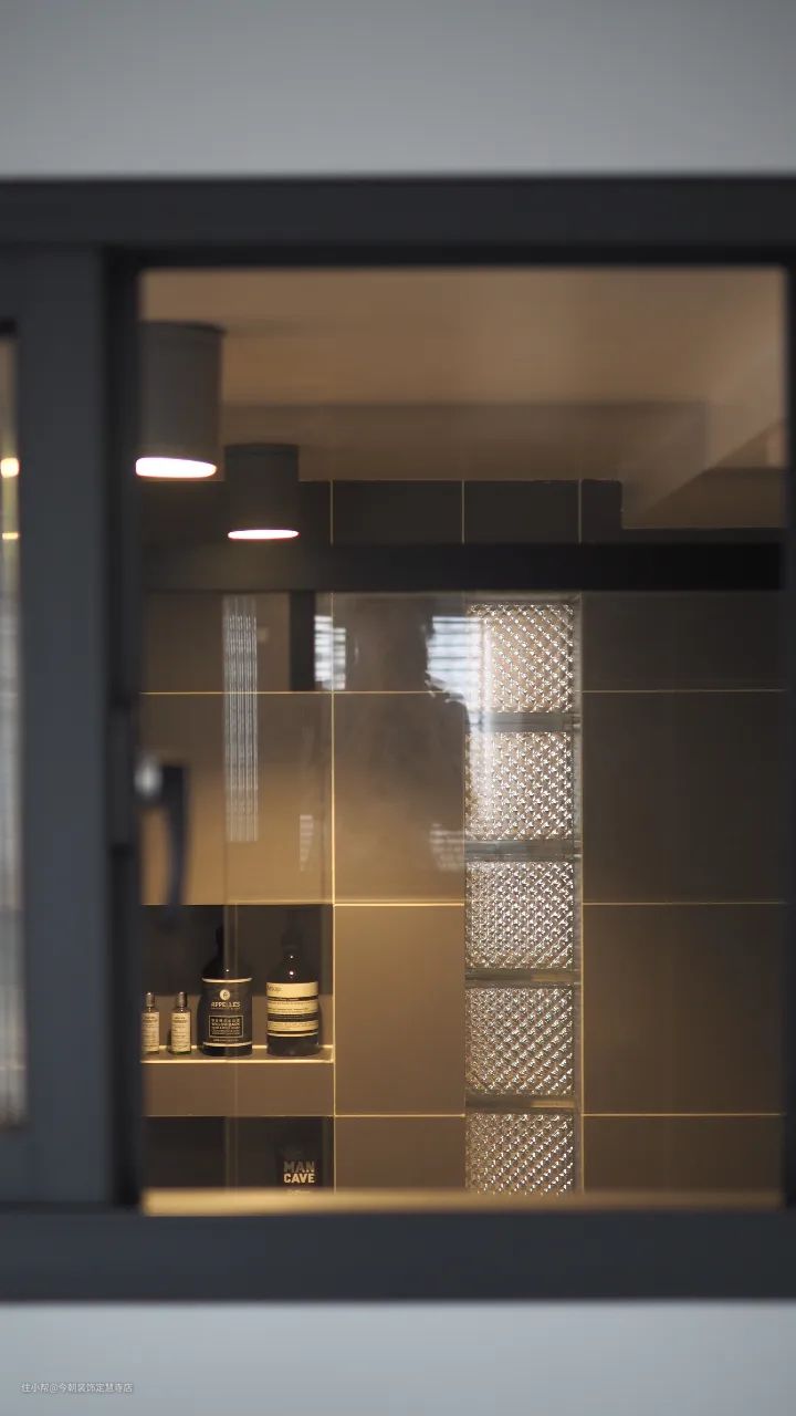 选择胡桃木偏深的家具搭配经典蓝。木质的温润感搭配略有工业风的黑色金属落地灯,凸显男性气质。对面浴室留下了一道竖长玻璃砖设计。