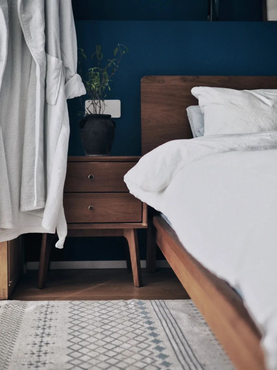 卧室的色彩设计是:经典蓝 + 胡桃木 + 白色。