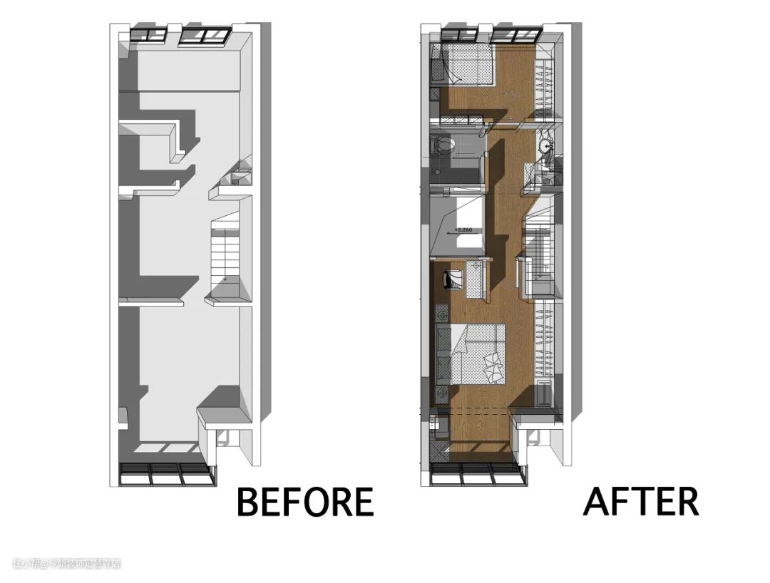 房主人是一个1.8m高的男孩,但他的家是单层只有一个2.2m高Loft。 一进屋之后很明显就有一种压抑感, 由于楼层高度无法更改,因此只能从装修开始。 当我看到这个设置时,我的脑子里充满了疑问:住在这样的房子里,不得压抑死?结果!!!