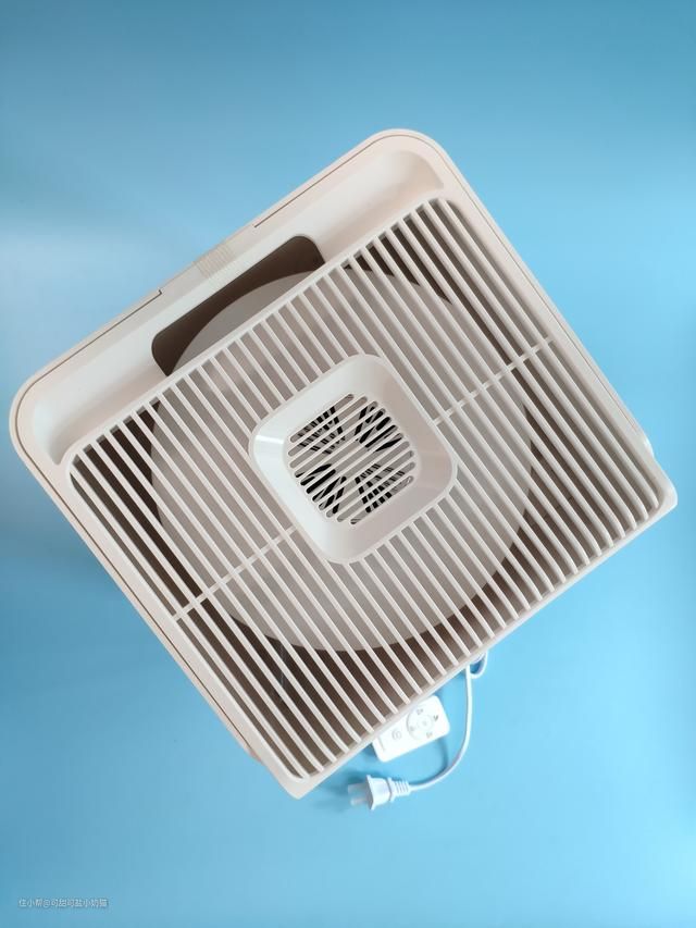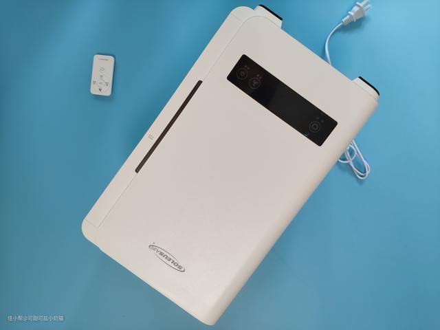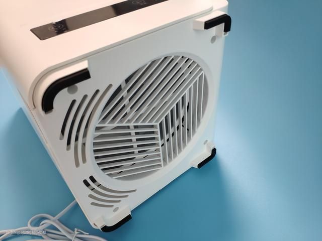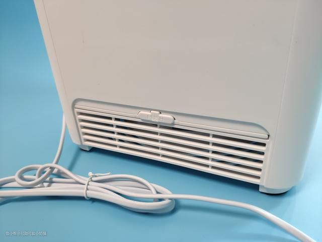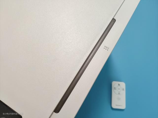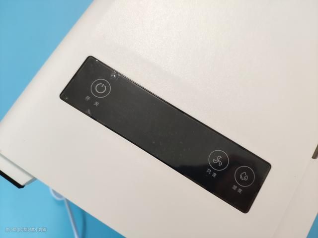 水尺内部底下有个蓝色的灯泡,俗称水灯。发蓝光也是由于它的原因,我们可以从外面清晰看到内部水位变化,水箱容量可达3.5L,加湿量可以达到300mL/h。缺水提醒后,还可以继续吹风30min,足够吹干湿帘。