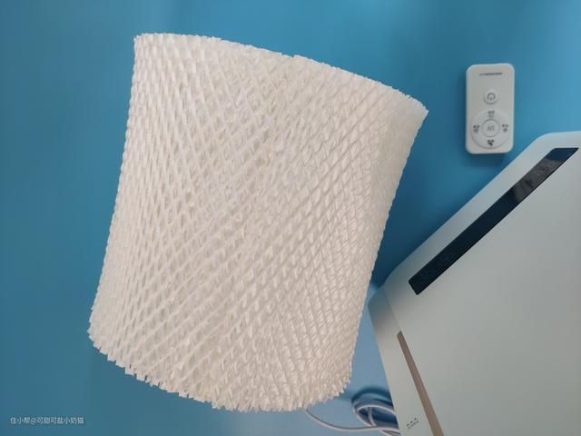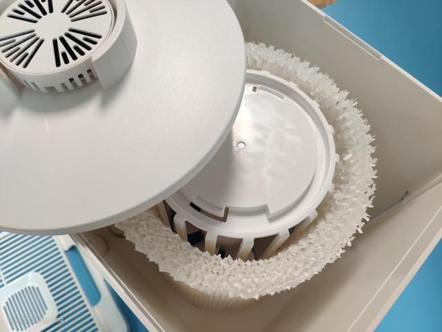水过滤盒是扣在一个端盖上的,它有一个旋转锁设计,上面有图标显示,旋转打开,就可以清楚看到加湿器内部结构,外面一圈白色的是有机高分子湿帘,说到产品的无雾操作,全部靠它来实现,采用有机高分子化合纤维,可以有效过滤水中沉淀杂质,解决加湿过程中出现白粉或者白雾。还可以有效挥发水气。