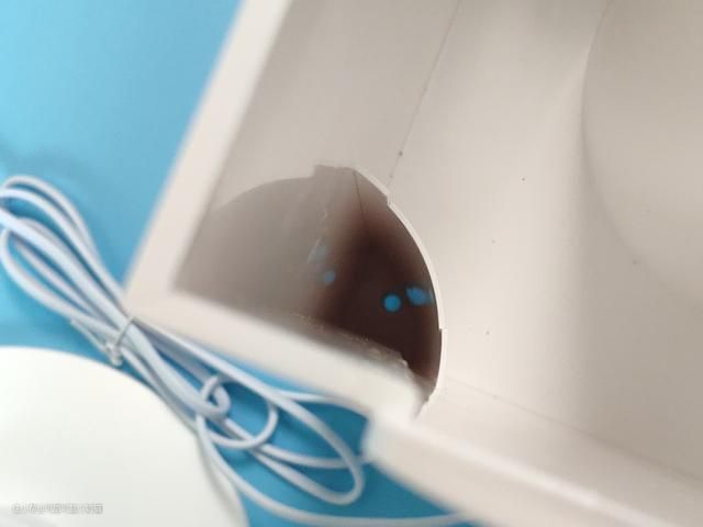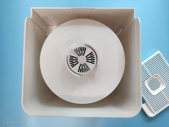 拿走湿帘后,我们就可以到加湿器本身部分,中间的圆柱底部就是一个扇叶,看到这里小编也知道起工作愿意,通过湿帘把水吸收到风扇顶部,利用风扇转动,把水的的湿气挥发上去,从而实现加湿效果。
