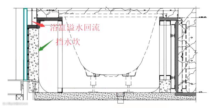 排水处应预留250~300mm洞孔,便于排水安装,在浴盆排水端部墙体设置检修孔。