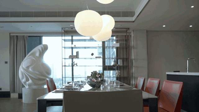 餐厅旁边的艺术装置灵感来源于水波的形状,与阳台边的天鹅湖水波呼应,也是屋主对家顺风顺水的美好期许。
