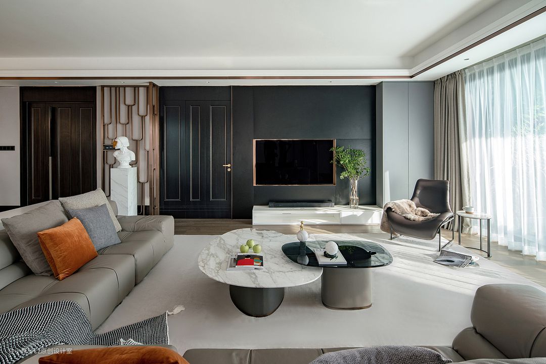 在茶几的选择上,一改传统方正款式,使用异形茶几叠加组成,高低组合,一黑一白,大理石与玻璃在色彩与材质上的碰撞饱涵趣味;一横一竖,层次上的上下错落有致。