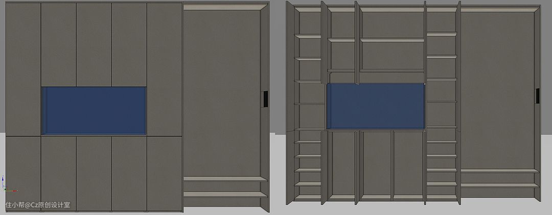 衣柜及书柜的模型 书房内也给男主人增加了书柜,同时也增加一个衣柜,书房和衣帽间的储物率得到平衡,对书柜的设计展示与藏书合二为一,一部分是开放区域,一部分为封闭区域,内嵌暗藏感应灯带,实用方便又不失美感。