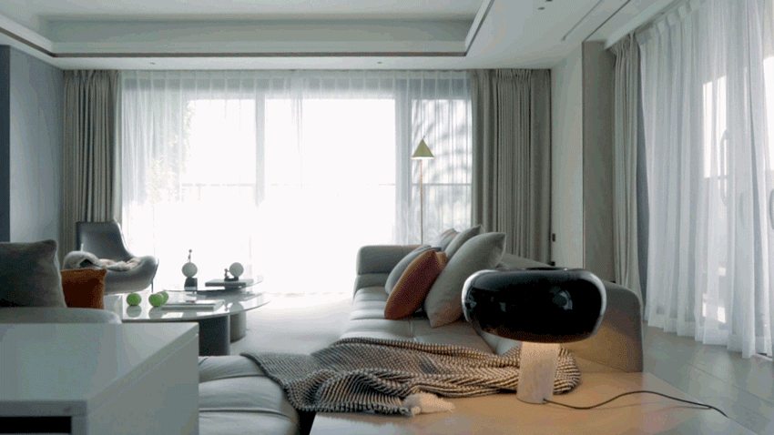 灯具:FLOS 落地沙发与米色大地毯贴合,蔓延至大半个客厅空间;以相近色系的落地帷幔与白色纱幔作为衬托,纵向的延伸拉长了视觉观感。