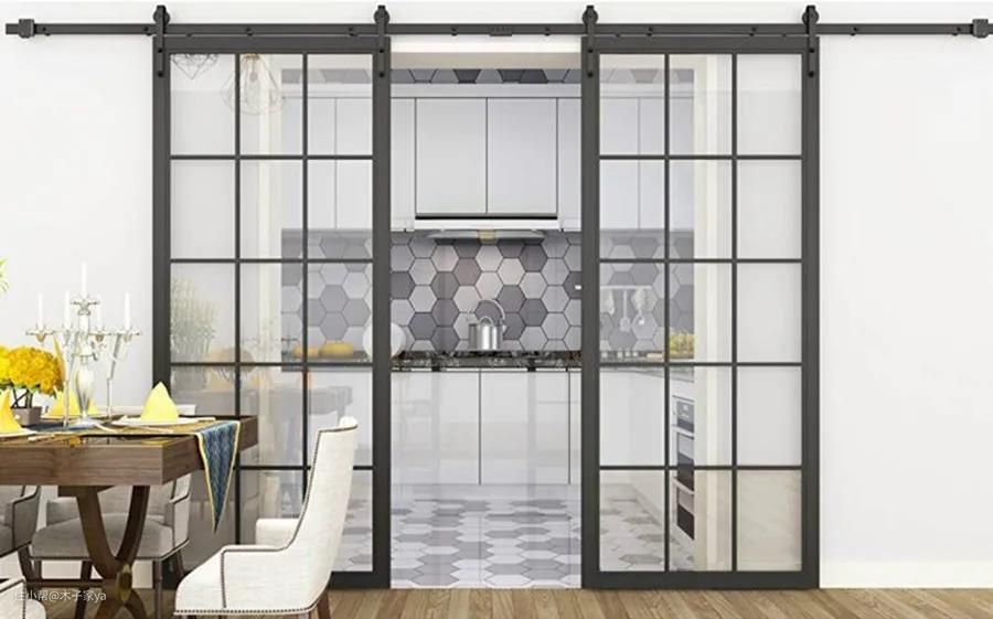 谷仓玻璃推拉门也很适合用在厨房门上,因为它可以一推拉移动到两边墙上,这样一打开谷仓门,一点都不影响厨房和其他空间的通透感。但是要注意做谷仓门的墙面要是实体墙,因为谷仓门属于吊轨门,比较重。