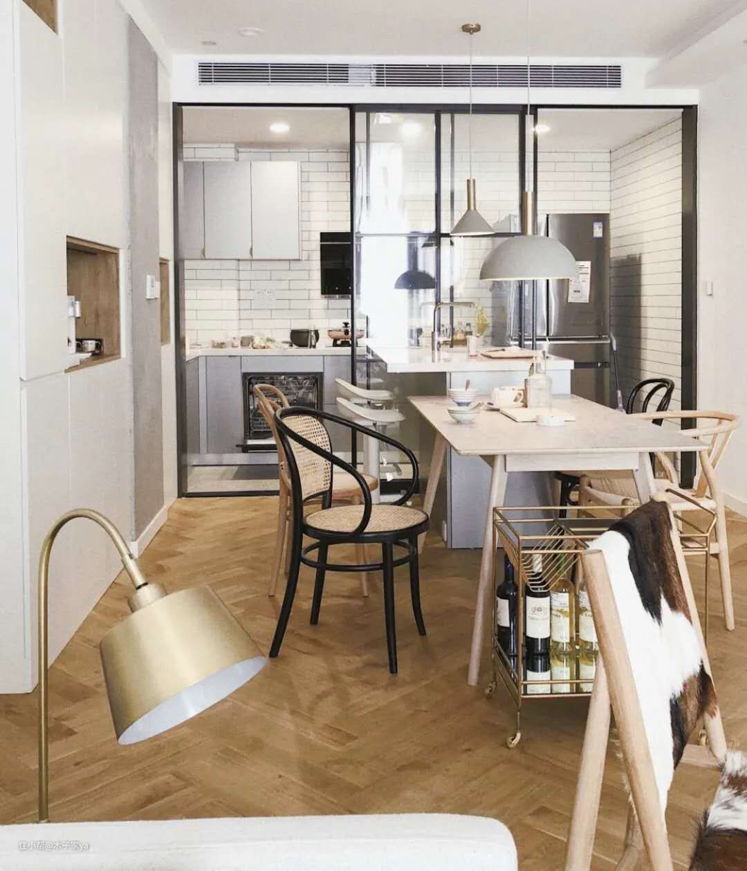 在厨房加一个折叠玻璃门,做饭的时候就关上门,不做饭的时候就打开折叠门,使得餐厅和厨房空间处于同一动线,一点也不影响视觉通透感。