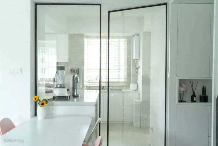 区别于传统的厨房推拉门只有两扇,为了通透感,可以把整个厨房门都做成通透的玻璃推拉门,最好是多导轨,这样可以把整个门推到同一个位置,大大提升整个厨房通透感。