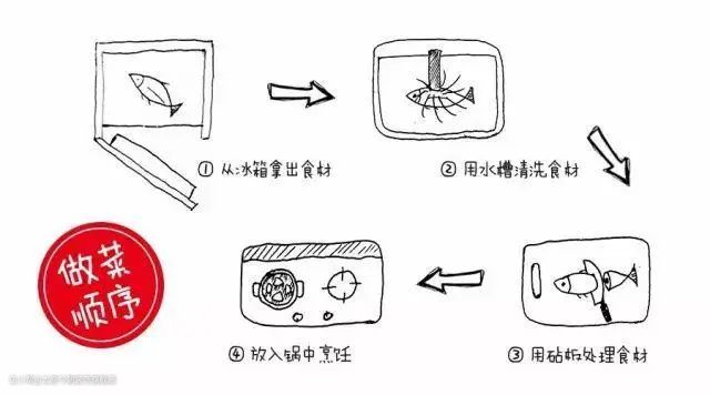 厨房好用不好用,首先看动线是否合理,最先考虑的肯定是做菜的顺序,从冰箱拿取食材、到水槽洗菜、切菜备菜、炒菜、起锅上菜,这整个动线越顺越好。专门为大家画了一个示意图如下: