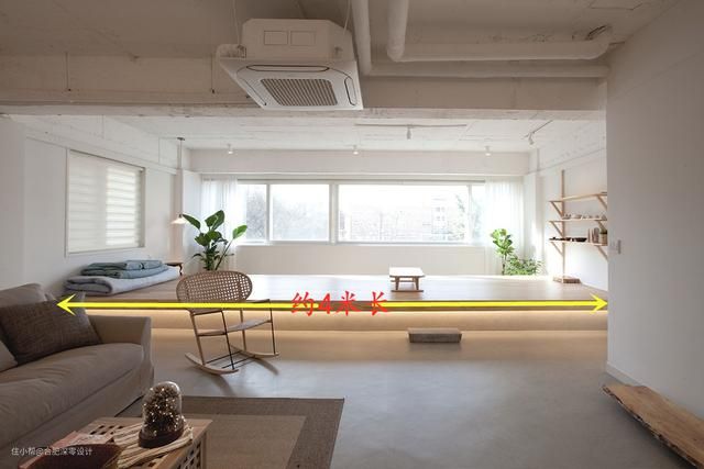 客厅阳台不装门,木板架空做成4米休闲区,能坐着喝茶能躺着睡觉