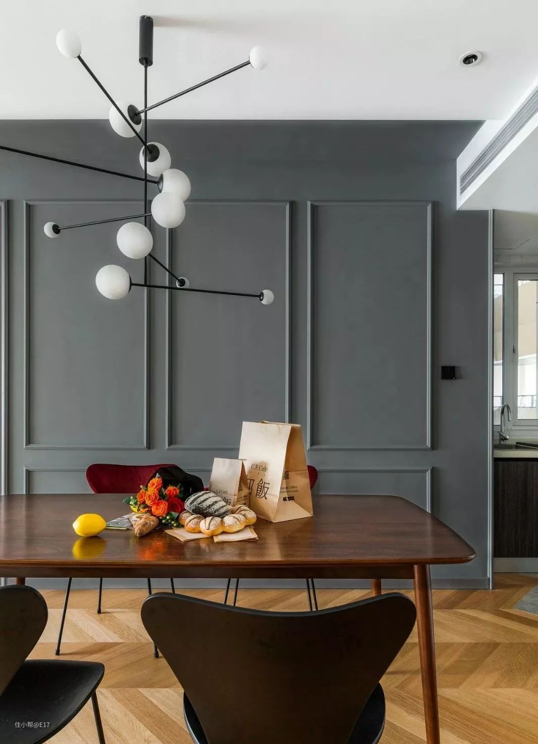 还有这种以石膏线+涂料的形式,来打造出简约而不失美感的护墙板造型,看起来也美美的,为空间增添了不一样的感觉。