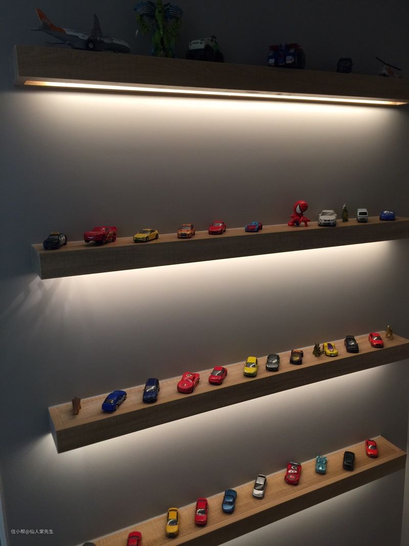 上图自下而上出光,采用45°偏光线性灯,安装在橱柜立面与平面夹角,光线能够均匀地照亮立面,物品宛若博物馆展品。