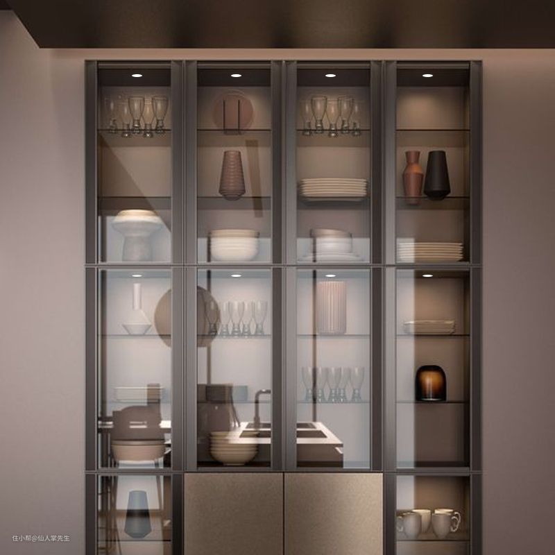 橱柜的照明灯具基本一致,都分为射灯与灯带。储物柜照明在照亮物品的同时,还会提供氛围照明,营造意想不到的效果。