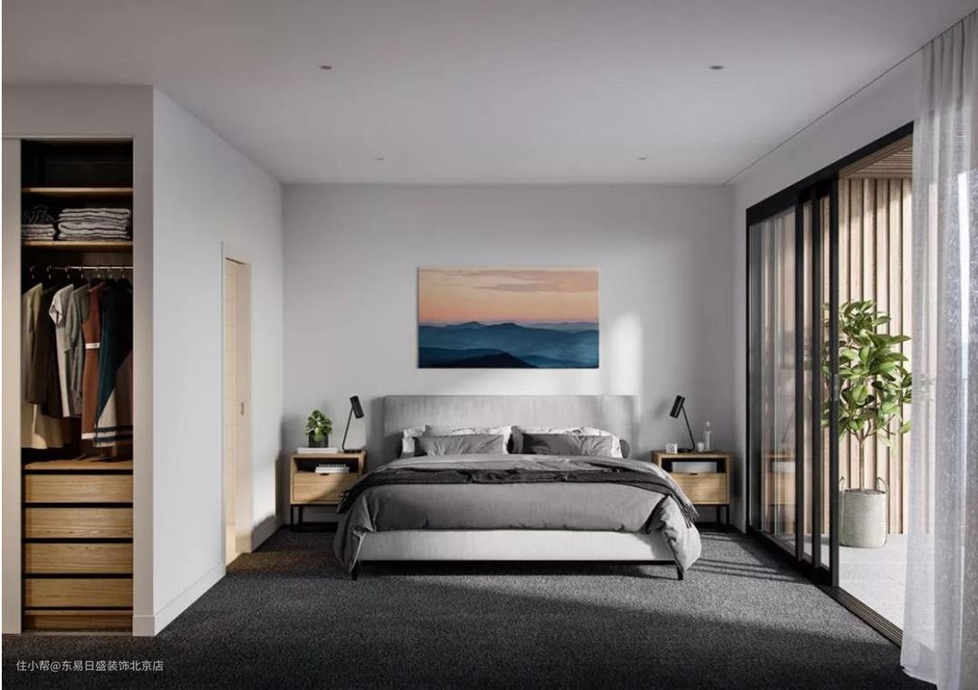 卧室的空间利用墙面或拐角定制一排柜子,实际的使用功能跟衣帽间一样,这样既节省空间,又不会显得拥挤。