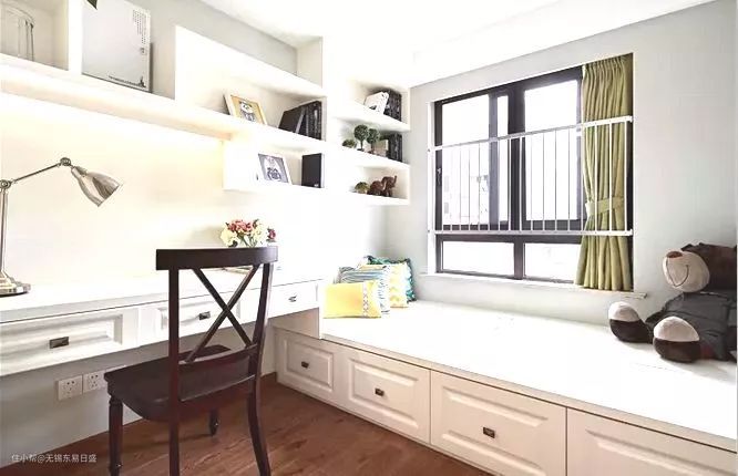 ▲靠窗的一边打造成小书房,书桌搭配书柜设计,很满足作为学习书桌柜要求。