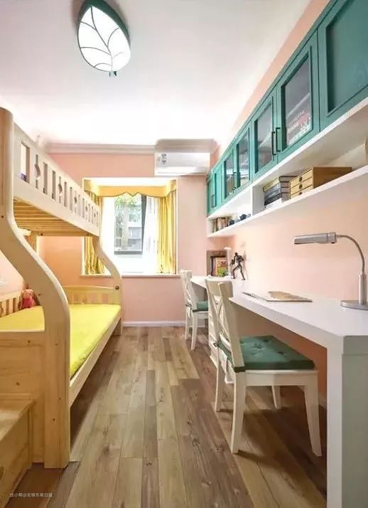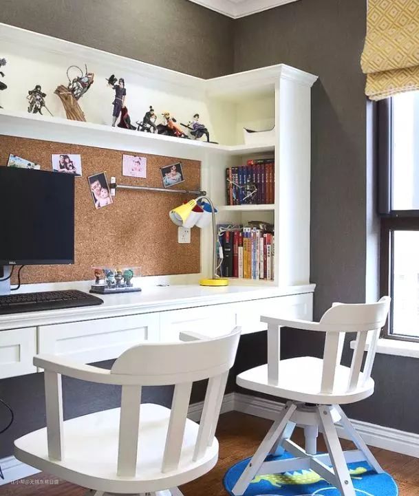 ▲双人儿童房设计,书桌书柜必不可少,一字型设计形式适合狭长的卧室空间。