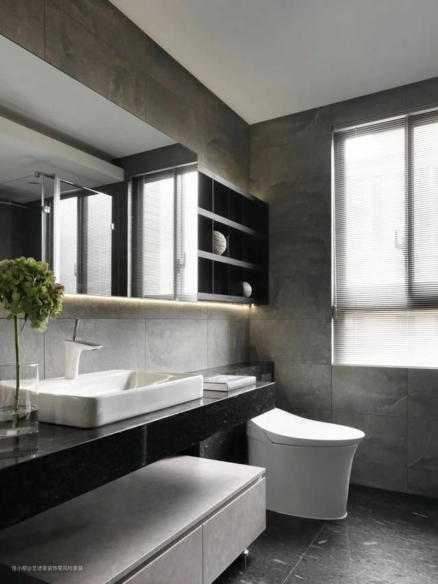 ▲卫生间整体是灰色的空间感,搭配黑色的洗手台台面与台上盆设计,而洗手盆后方的镜柜,也设计延伸到马桶后方,让空间收纳更加实用方便。