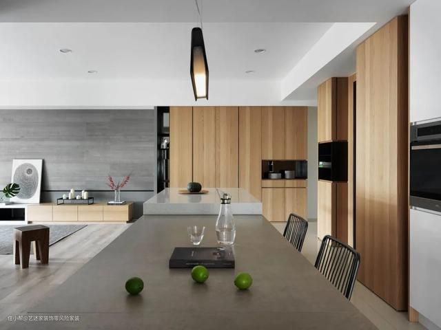 ▲餐厅区域布置灰色台面的餐桌,旁边挨着一个白色大理石台面的中岛台,侧边木质的电器柜布置,整体空间显得简约自然而又温润大气。