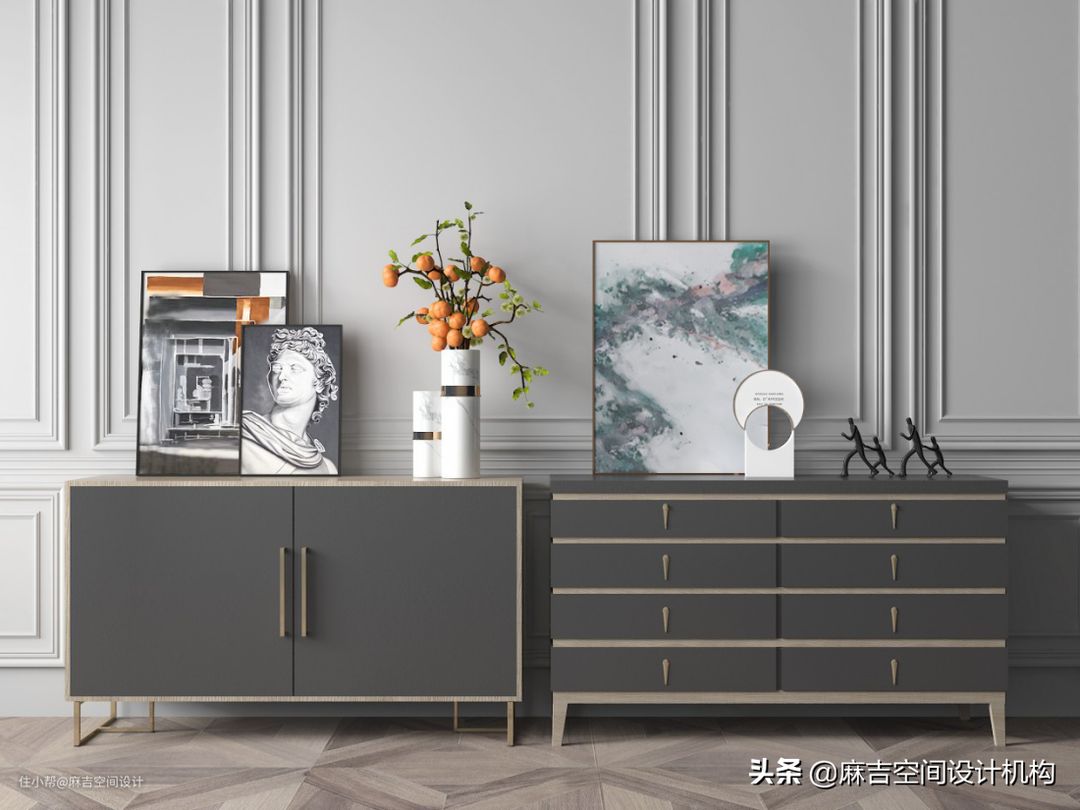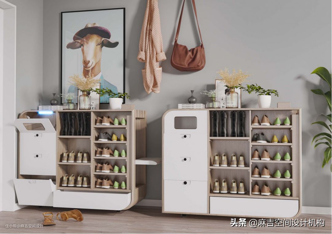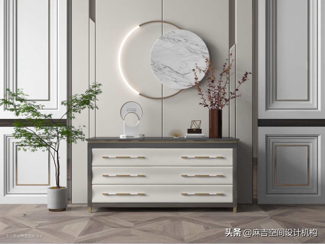 6.玄关处的家具摆放要合理,满足自己的生活习惯外不影响来回走动,若是面积小,可以考虑从鞋柜、低柜等家具入手,扩大储物空间。也可以把落地式的家具改成悬挂的陈列柜、低柜改敞开式的挂衣柜。