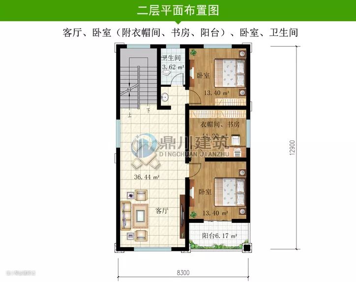 二 层:客厅、卧室(附衣帽间、书房、阳台)、卧室、卫生间