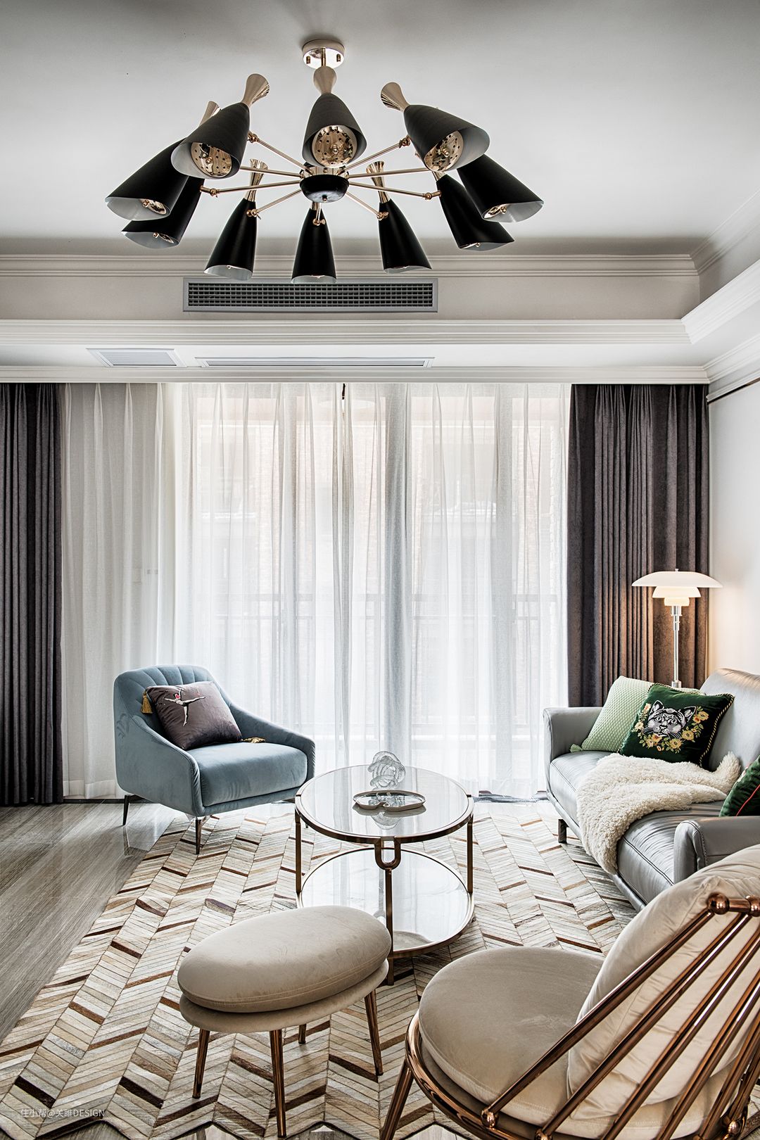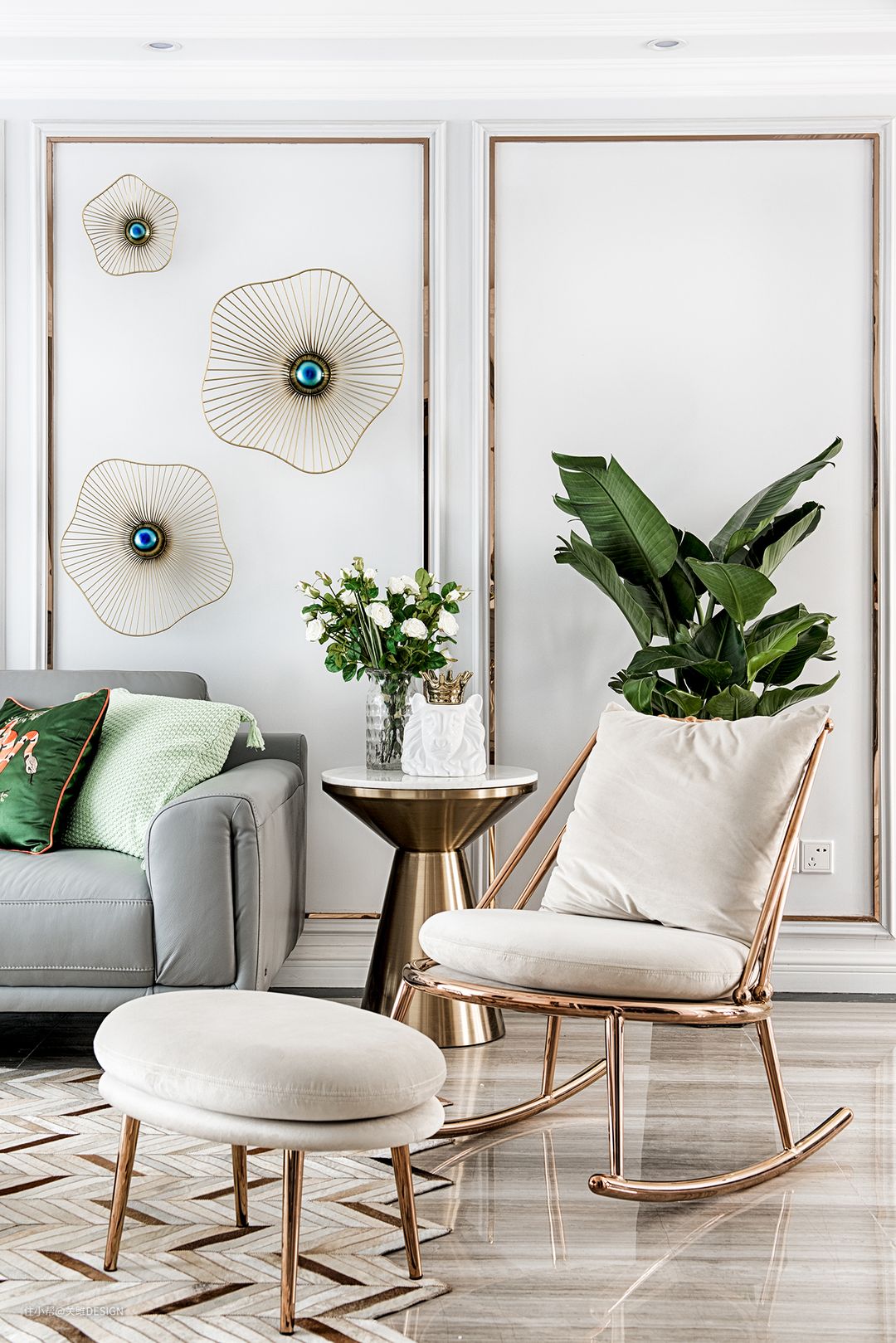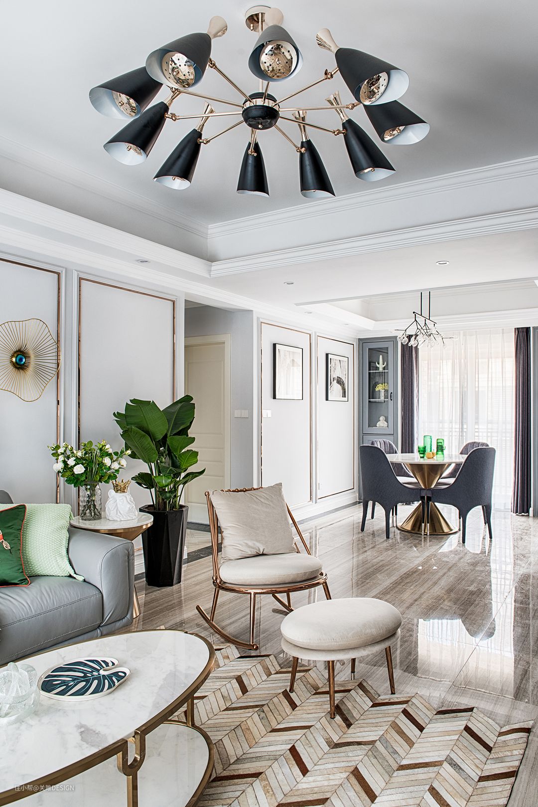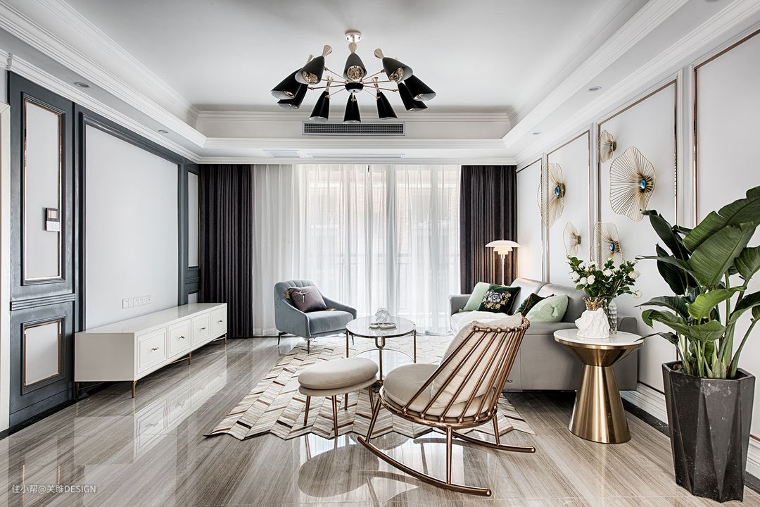 ▲客厅空间的硬软装融入了多种风格元素,美式边框、中式墙饰、轻奢金属质,搭配出一种高级华丽的优雅档次感。