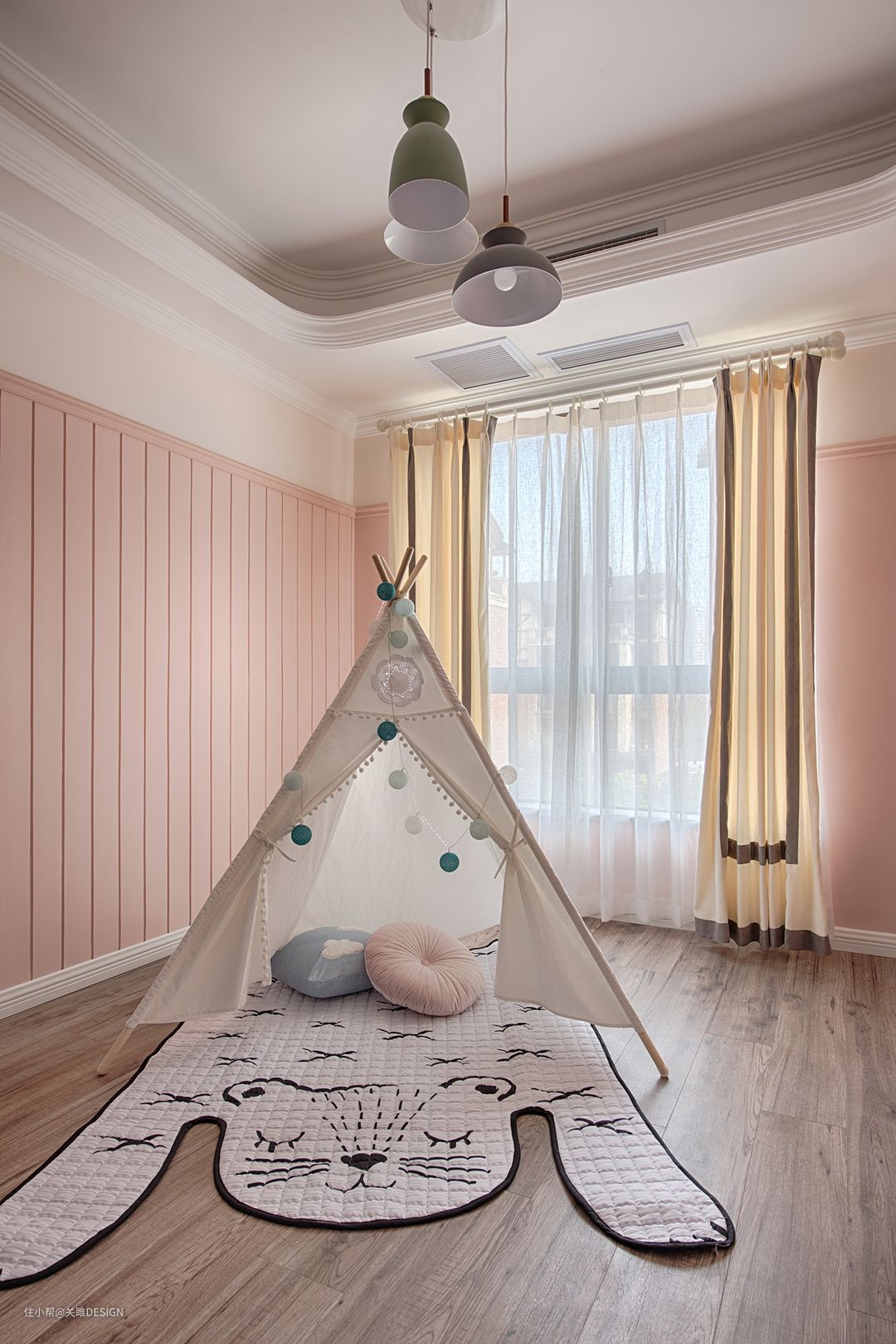 ▲儿童房暂时留空,墙面装了粉色的拼色设计,还在墙面上加入了粉色的护墙板,让空间更加耐用有质感,中间布置小帐篷,让空间成为孩子的活动玩耍区。
