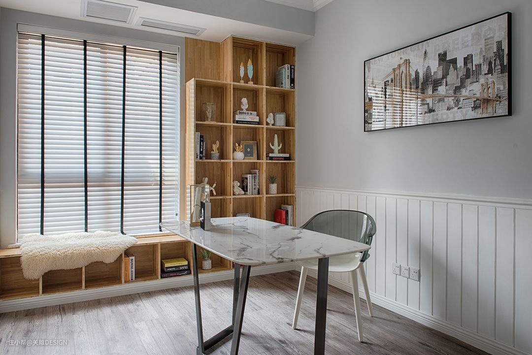 ▲书房靠窗装上木色的开放书架+飘窗柜组合,为空间带来实用的收纳;中间布置一张大理石台面的书桌,后方墙面以白色护墙板+灰色墙漆,挂一幅建筑风的卡通画,让工作氛围显得简约自然而优雅。