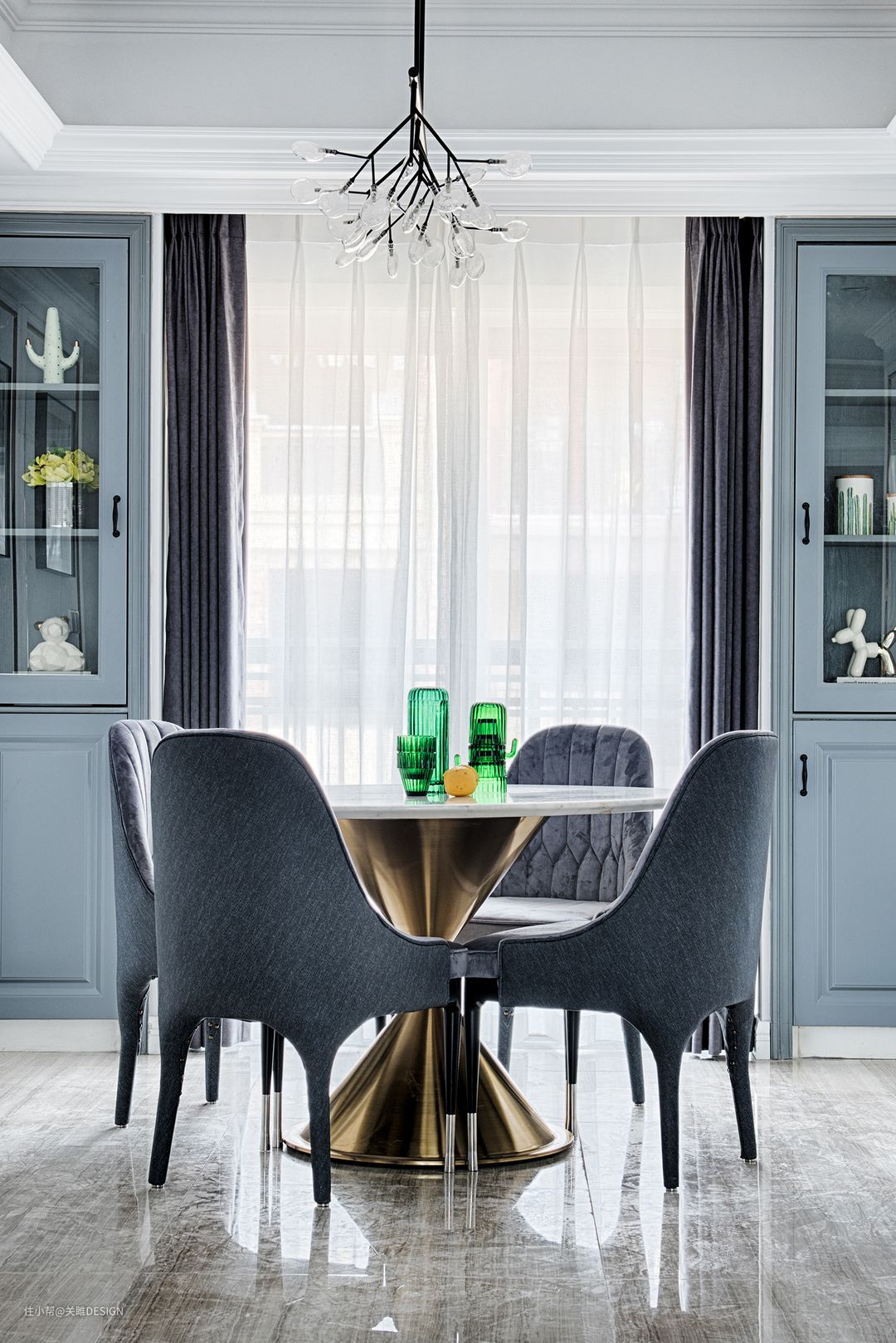 ▲整个客厅餐厅的地砖是带点灰色的仿古抛光砖,背景墙以金属边框线条,挂上装饰画,靠窗两侧定制蓝色的餐边柜,中间布置金属脚+大理石台面的餐桌,布置几张舒适的皮质餐椅,让用餐空间也充满端庄的仪式感。