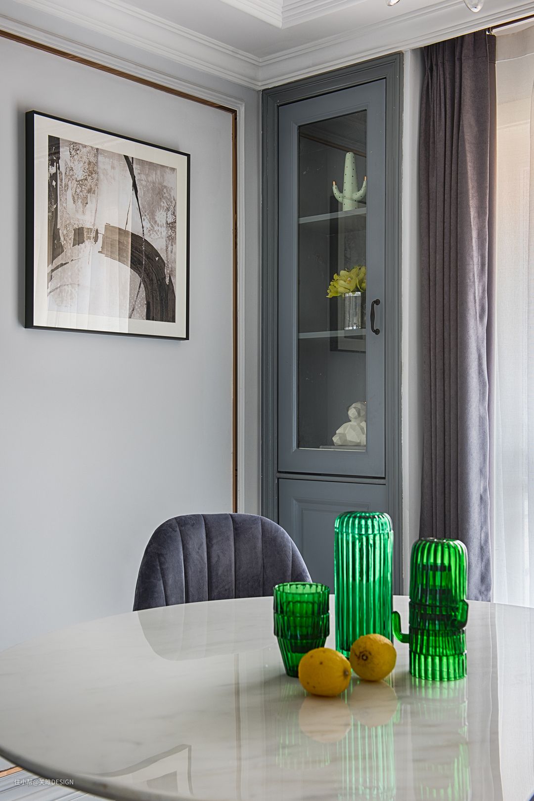▲餐边柜玻璃门的柜子里放着精致的装饰品,餐桌的绿色玻璃花瓶与杯子,也为空间带来了几分独特的高级轻奢感。