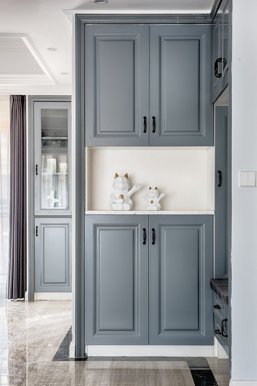 ▲玄关位置定制鞋柜+换鞋凳组合,蓝色的柜子+白色的柜中柜,还有两个猫咪陶艺品,使得回家的充满端庄优雅而安静舒适。
