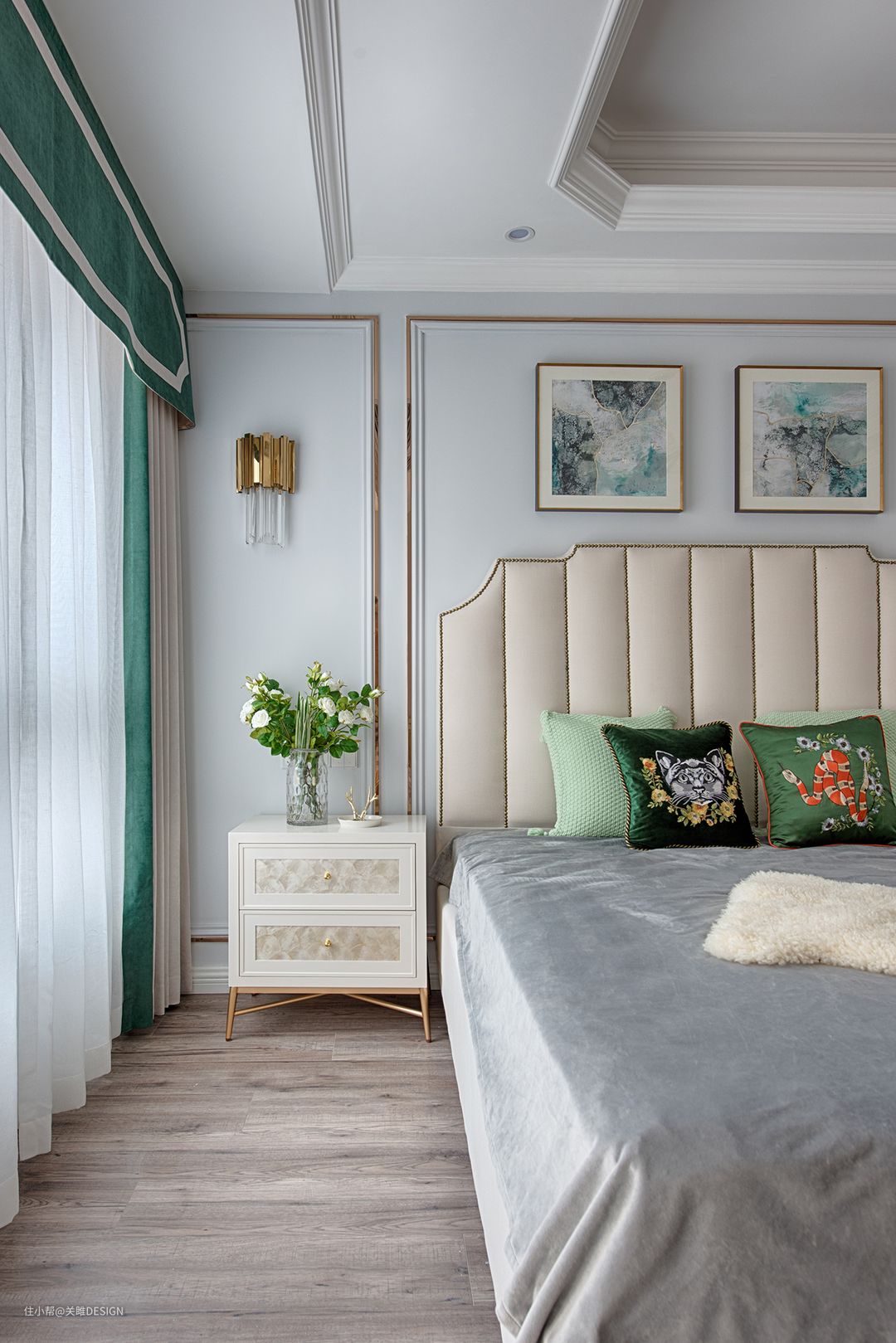 ▲卧室空间也是以浅蓝色的墙面,背景墙上加入金属边框的造型,床头柜上两幅方形的装饰画,布置米白色的皮艺床,细节处墨绿色的窗帘与抱枕装饰,也让空间显得更加轻奢雅致。