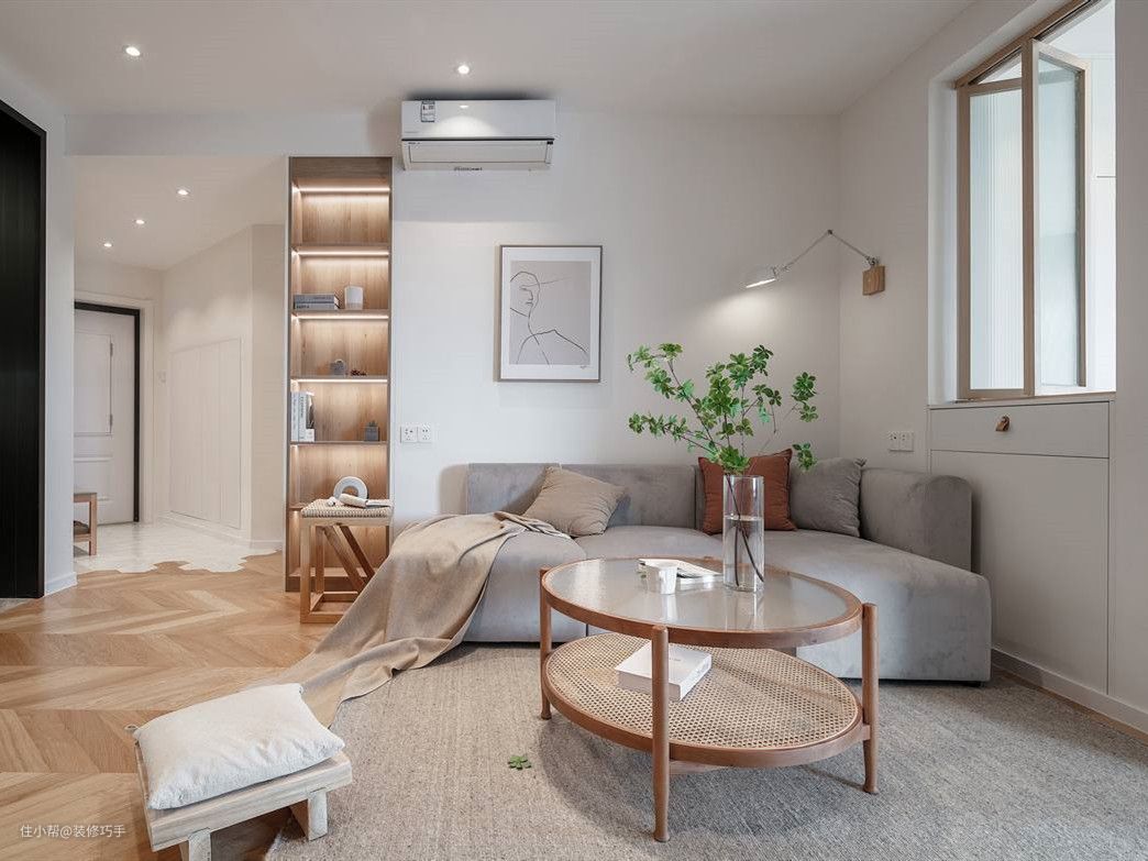 客厅的这组沙发柔软又质朴,很是让人喜爱,暖灰色加木色的搭配显得清新又温暖,小茶几也是非常质朴,上下两层的设计还挺实用,灰色地毯让客厅多了些质感,沙发上的毛毯又让空间多了几分轻松和随性。装饰柜上的灯带所映射的光十分温暖,与客厅地板形成了呼应,使整体效果更加舒适。沙发右侧墙上的窗子是主卧的内窗,有了这扇窗子客厅清新的感觉更加浓厚了。