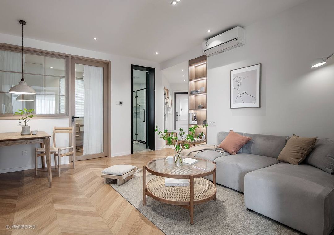 大家可能会好奇,客厅怎么安装了一个壁挂式空调呢?其实这是屋主自己的考量,一是因为小空调不占空间,比较省地儿,二是比较省电费,三是与简约风格比较搭配。