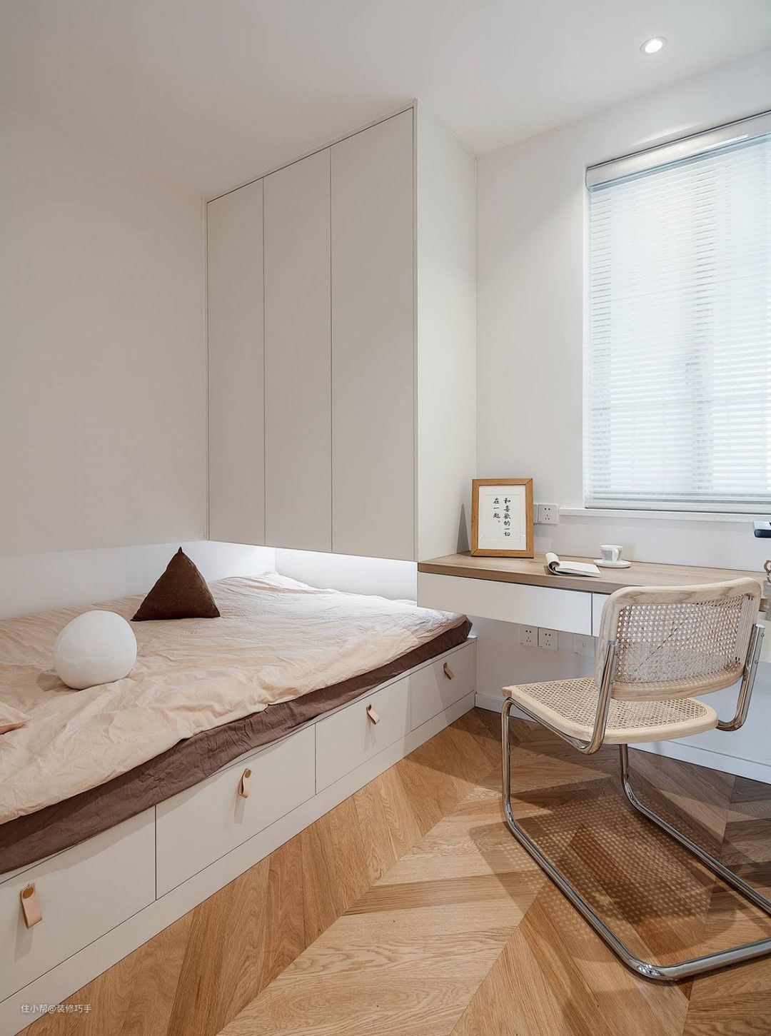 次卧的书桌是悬空的,非常节省次卧的空间,使得空间很通透,书桌使用了两种颜色,桌面是木色,抽屉和结构是白色,简约时尚。很多朋友可能会问桌子是怎样装在墙上的,是怎样固定的呢?其实很简单,因为书桌都是用一块块木板组装起来的,也是可拆卸,每块木板之间都有固定件,螺栓和卡扣装好就会很牢固,桌子中有一块长木板需要与墙体固定好,这里使用了膨胀螺丝,所以让整张桌子悬空,而且很牢固。