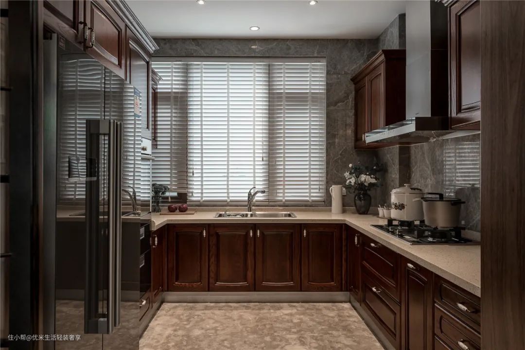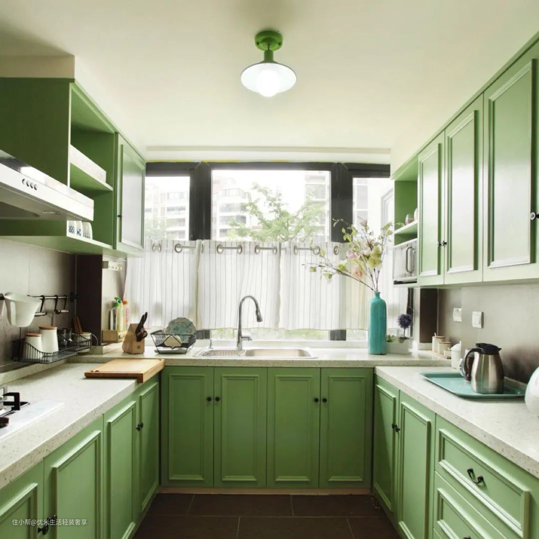 U型布局是橱柜环绕三面墙,这种设计的功能相对更齐全。