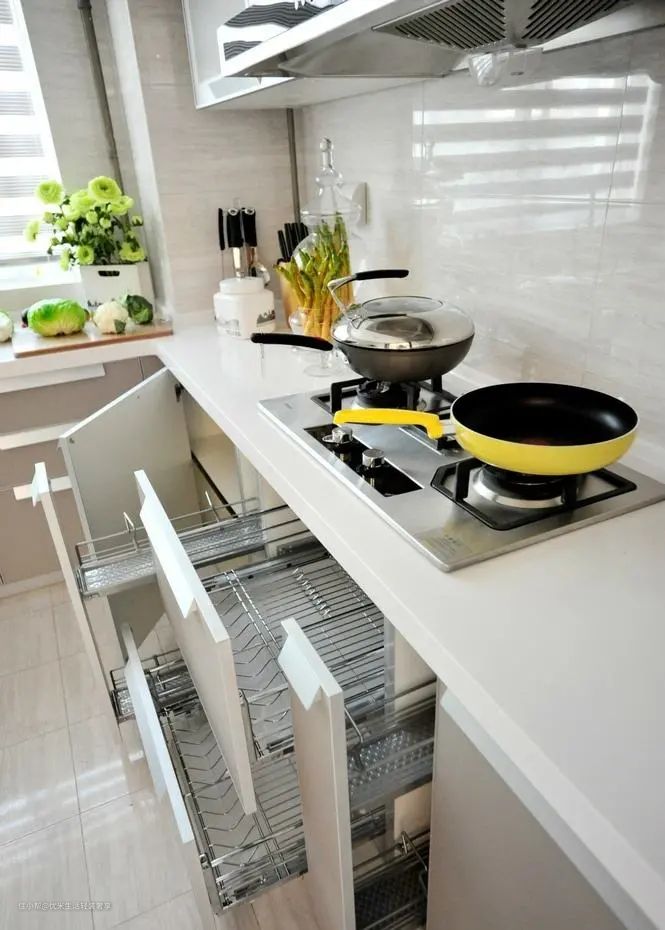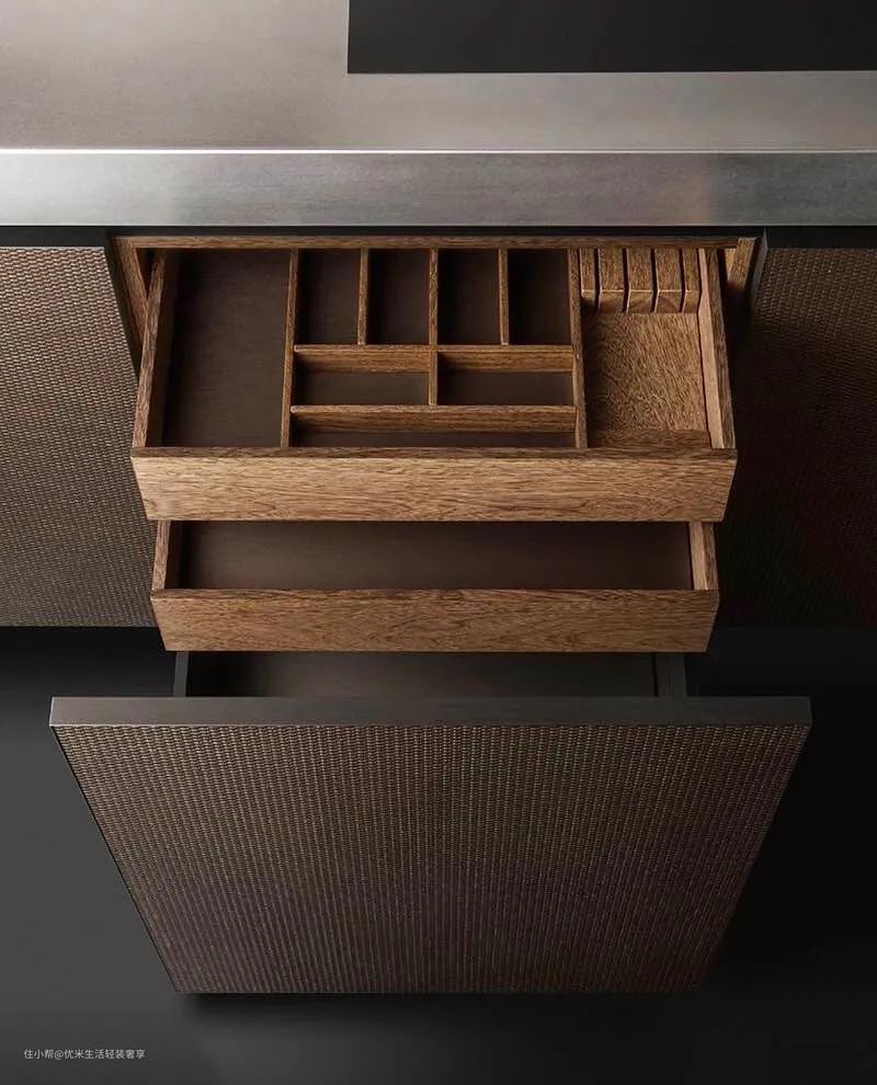 我们可以做不同厚度的抽屉,最上层放置餐具或者常用的调料,下面可以放置一些需要储藏的东西或是厨具。