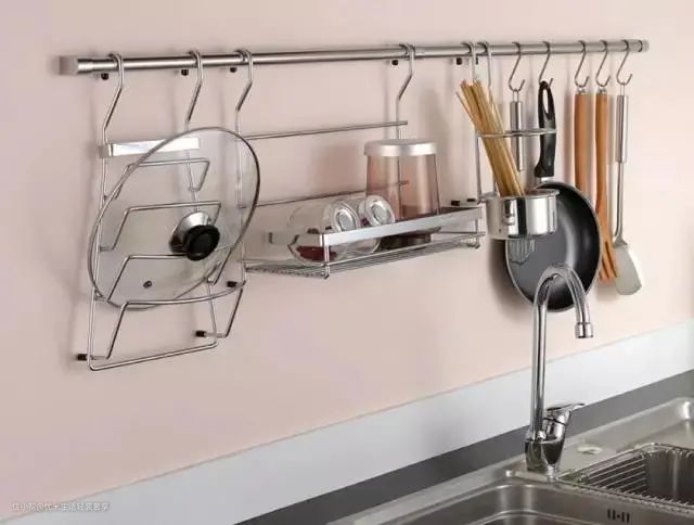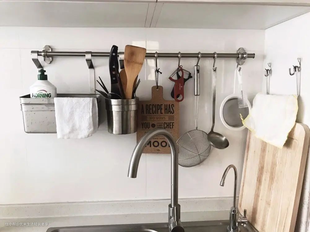 墙面空间使用挂杆挂钩收纳一些常用的厨具,不占空间随手可取。