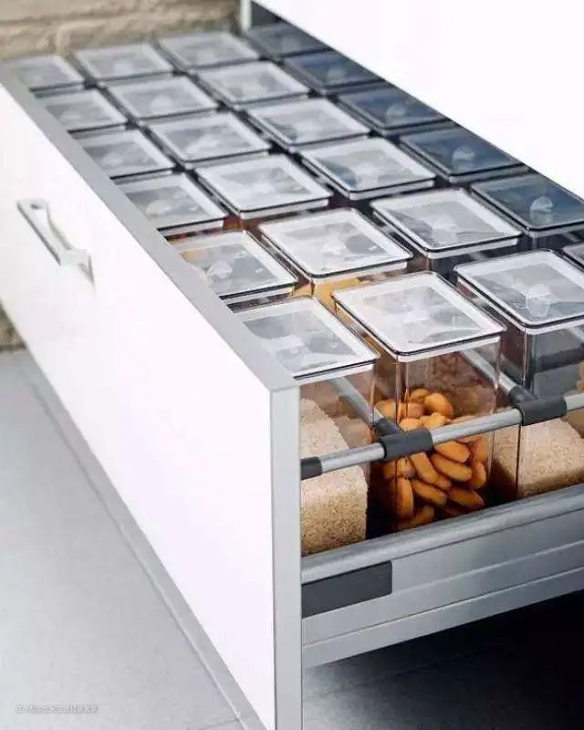 各种调料、香料、干货以及米面粮食,可以使用同类型的罐子、盒子分装,常用的放在触手可及的地方,其他需要储存的就可以放进柜子里。