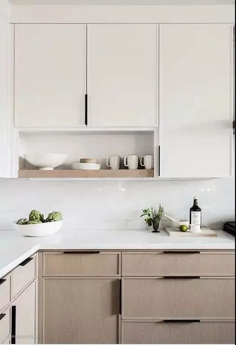 吊柜设计也要注意虚实结合,常用的、随手的东西尽量不要放在柜子里,留一些开放的置物空间会更方便。