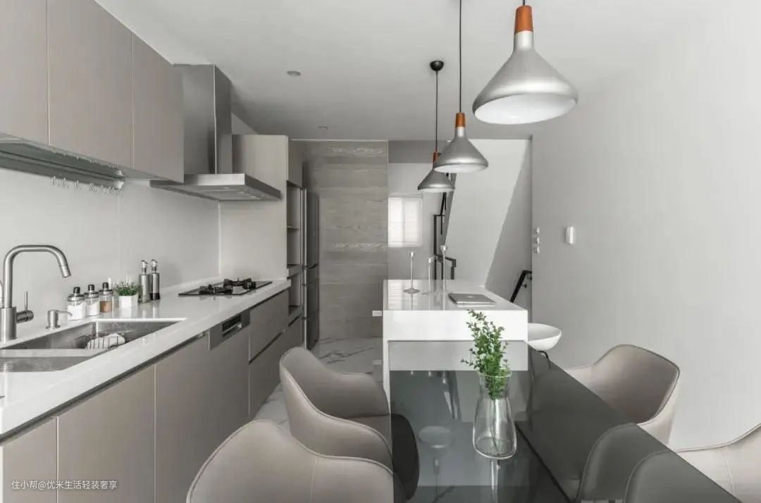 也可以将厨房一部分功能移到其他区域,打造“第二厨房”。因为我们进厨房可能就是烧点水、去冰箱拿个东西、拿个杯子泡点茶、洗个水果之类的“小事”,不需要复杂的烹饪过程,只需要满足我们日常简单吃喝的需求即可。